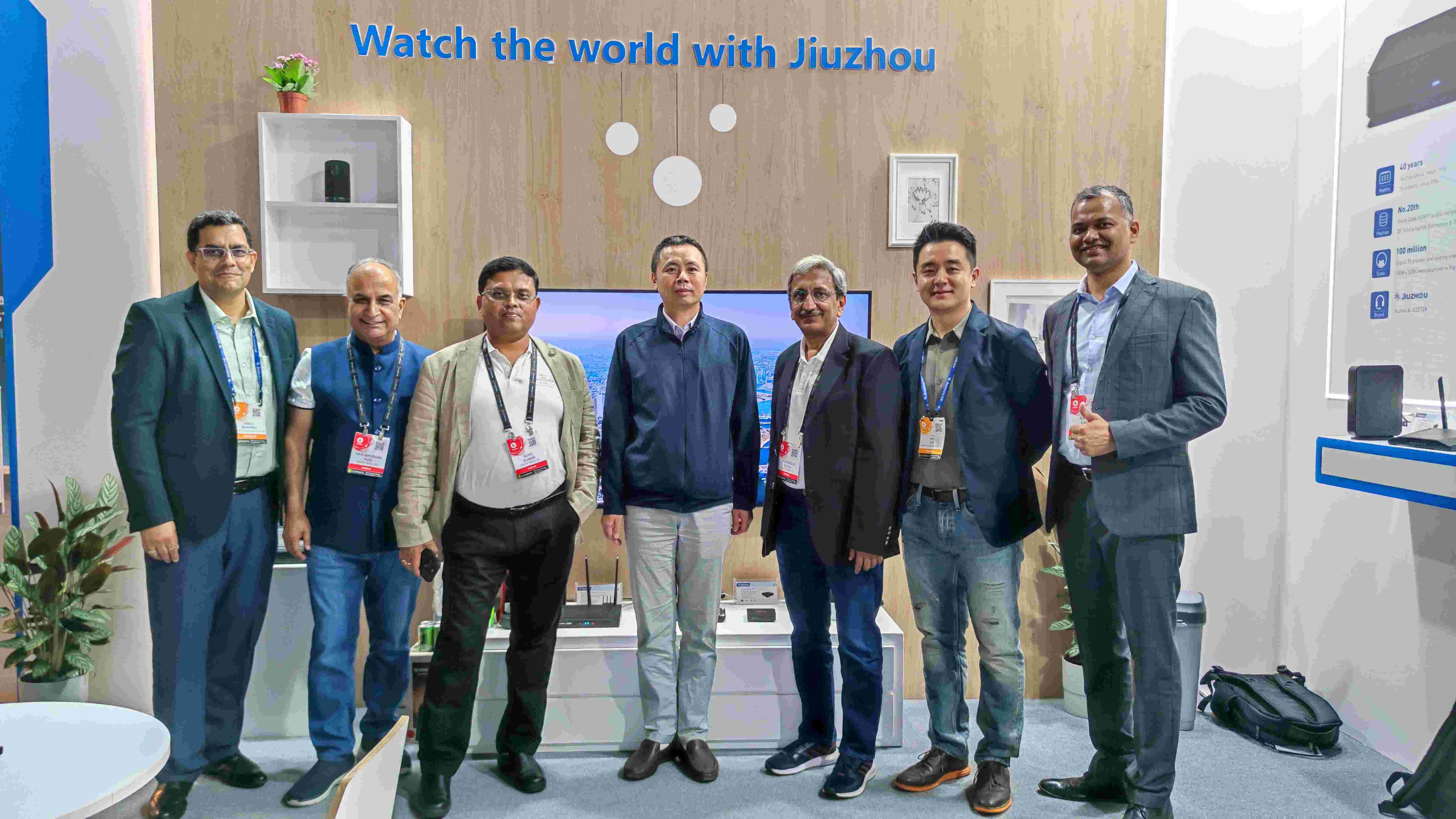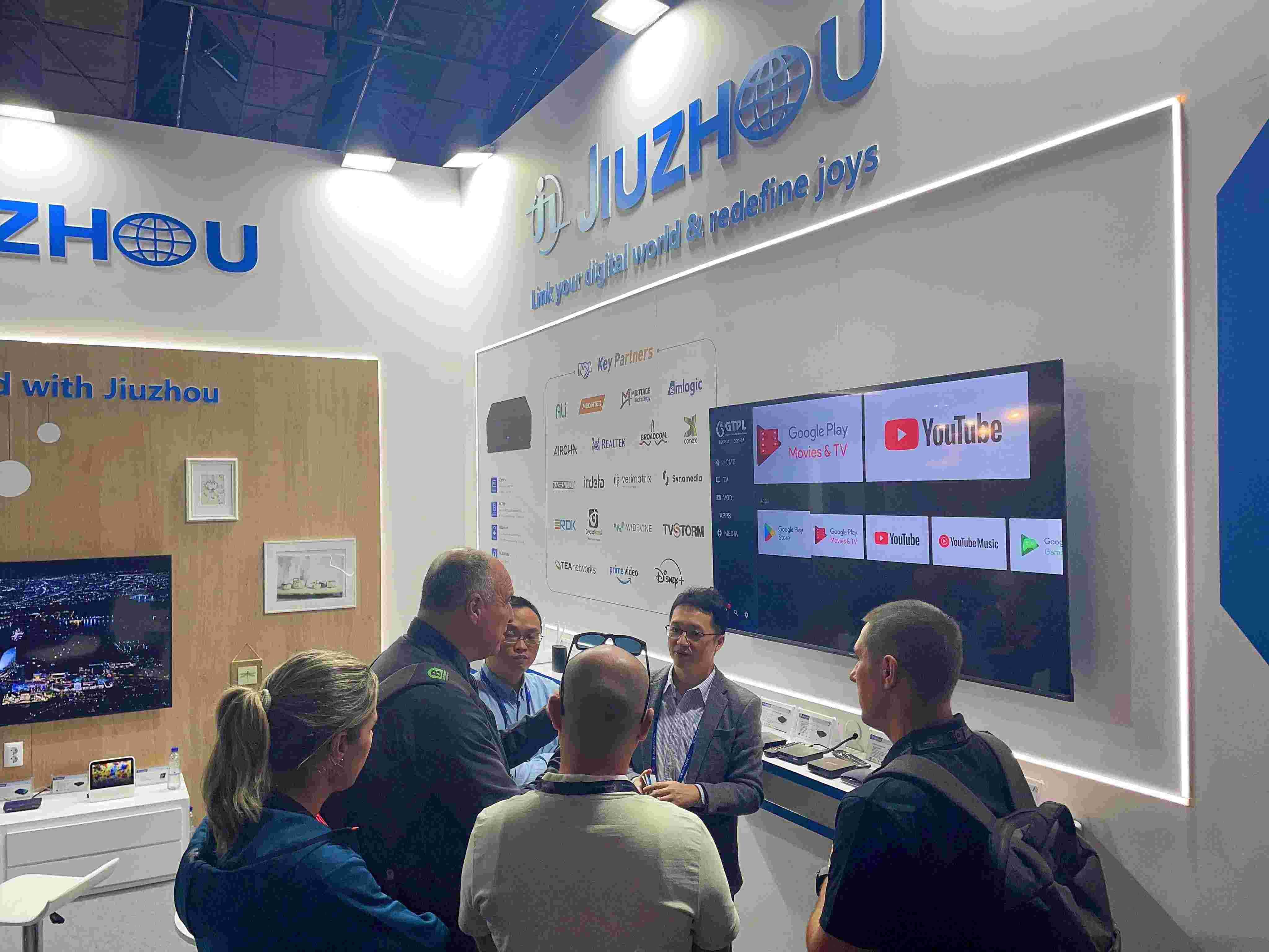 深圳九洲電器作為全球領先的數字音視頻融合智能終端提供商,本次展會公司總經理韓高典親自帶隊遠赴荷蘭,參展的產品不僅有Android TV 智能機頂盒,RDK機頂盒,5G CPE,WiFi-6路由器等專業級數字終端產品,還有8k超高清機頂盒和智能音箱等新品亮相,向廣大觀眾展示了多維度、多功能的智慧融合終端解決方案。